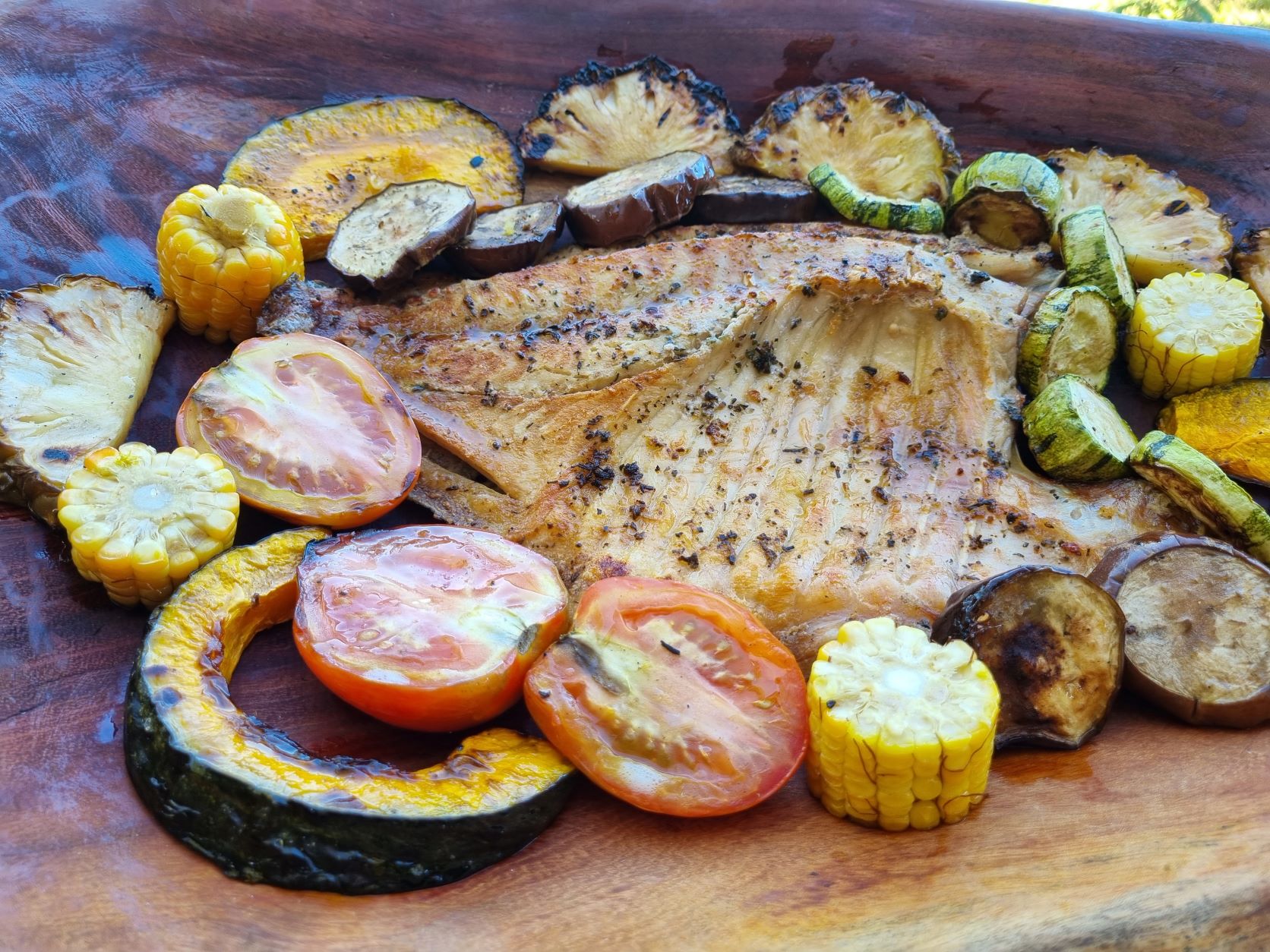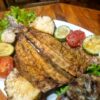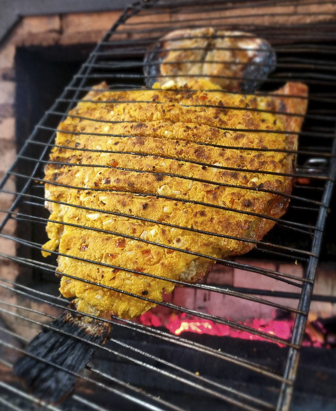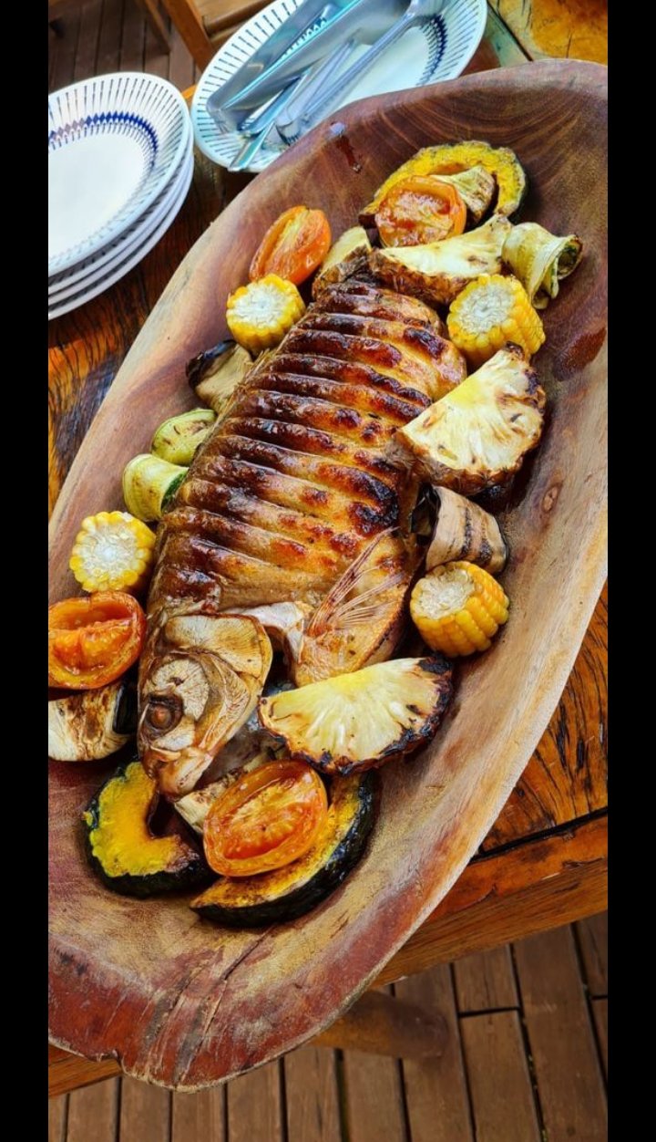 Banda de tambaqui sem espinho ‘y’ assado na brasa, acompanhado de arroz, pirão e legumes grelhados. Serve 3 pessoas. | R$198,00 | |