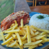 Berinjela empanada coberta com muçarela, molho de tomate do chef e queijo parmesão. Acompanha arroz e batata palito. | R$44,00 | |