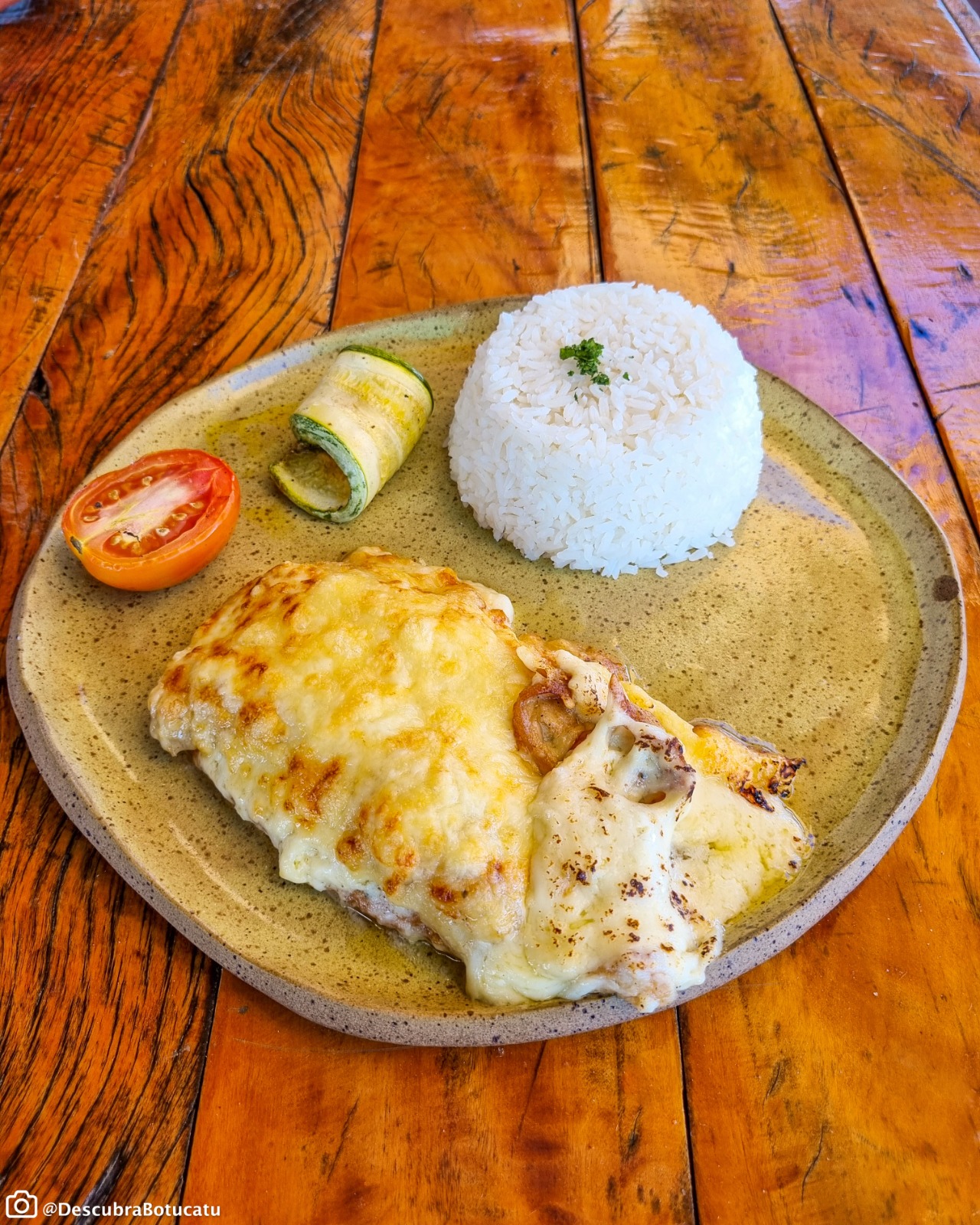 Receita típica do Ceará. Tilápia grelhada coberta com banana nanica chapeada, molho branco e queijo muçarela gratinado. Acompanha arroz, tomate e abobrinha grelhados. | R$68,00 | |