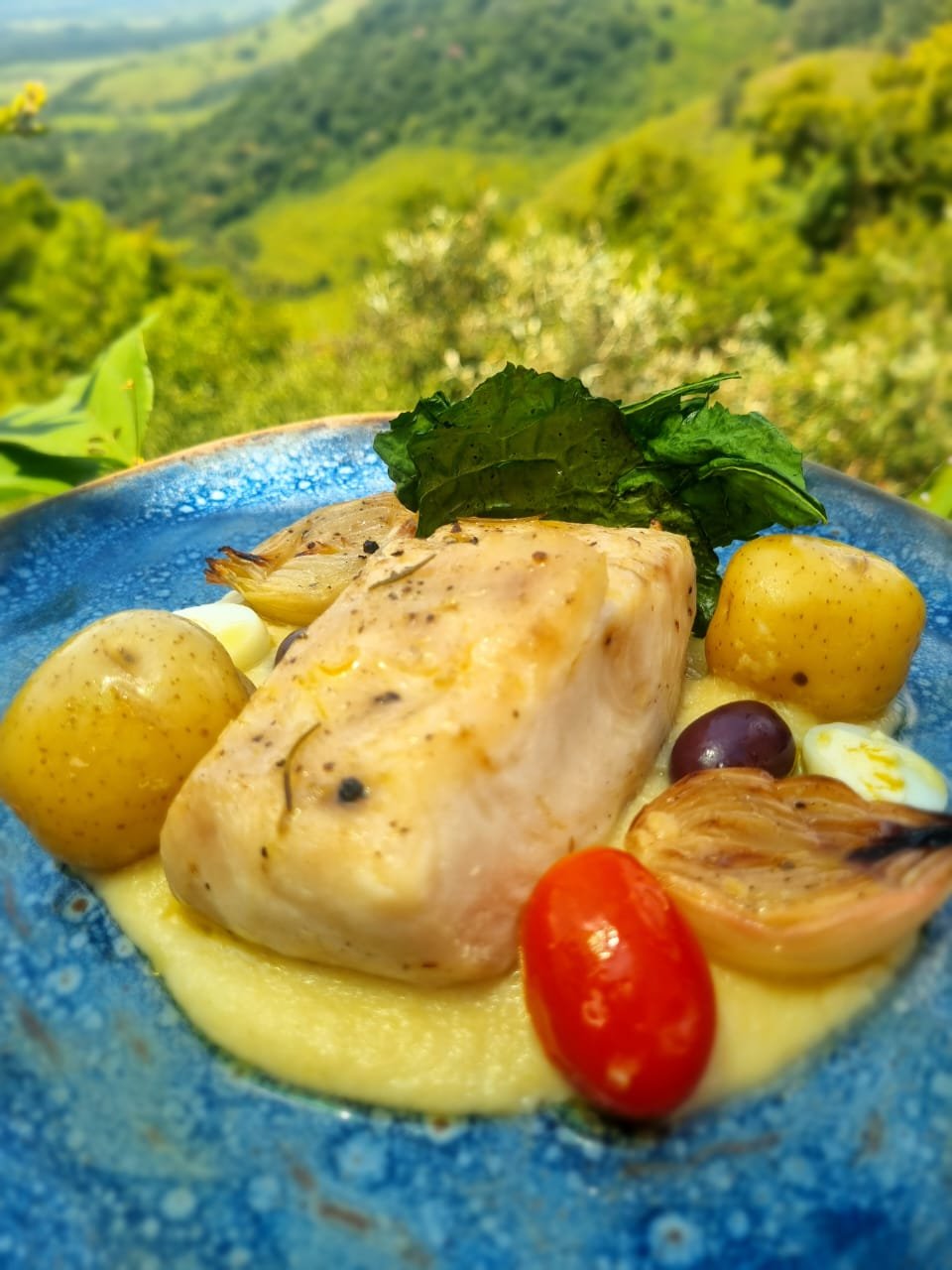 Lombo de pirarucu confeitado, servido numa cama de Musseline. Musseline de batata com alho assado e limão siciliano. Acompanha-se com cebola assada na brasa, tomate confeitado, ovo de codorna, azeitona preta, batata bolinha e couve crispy. | R$80,00 | |