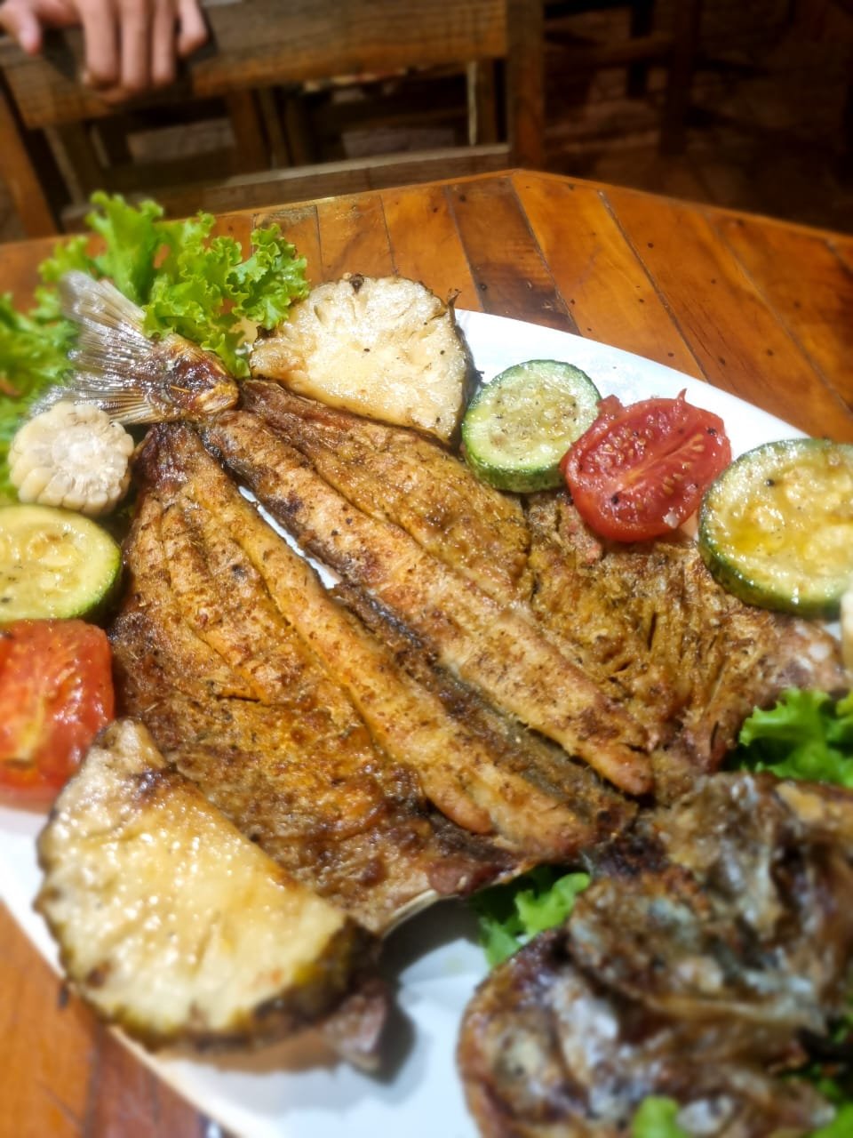 Costela de tambaqui assada na brasa com legumes grelhados, acompanha farofa de banana ou bacon, arroz e pirão. | R$73,00 | |